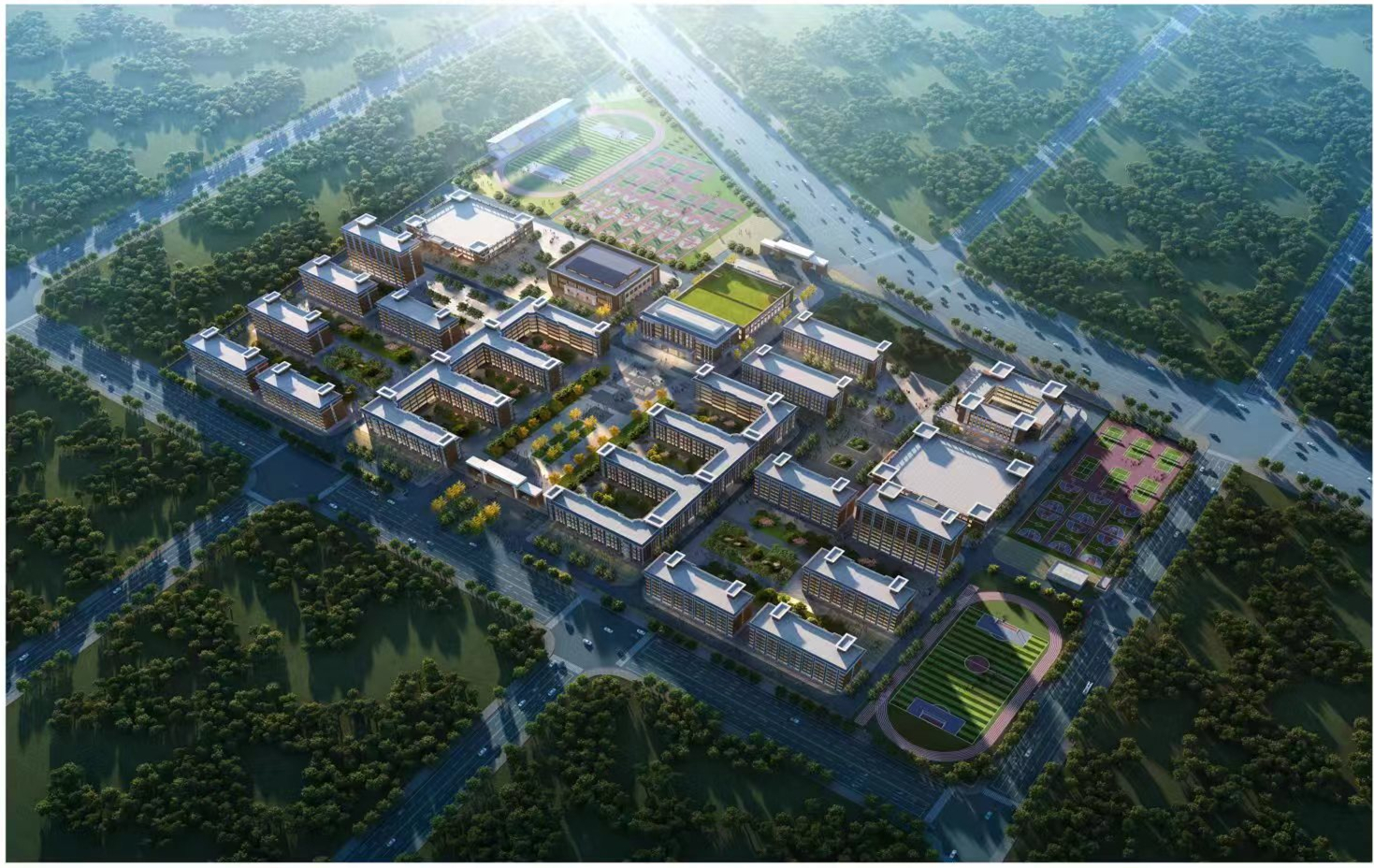 体育设施主要包含:1个400米跑道运动场,1个200米跑道运动场,18个篮球场,15个排球场,60个乒乓球场地,器械操场约4000平方米,室内比赛场地3个,项目建成后可新增高中学位5000个,有效解决高中“大班额”问题,从而进一步提升高中教育教学水平。