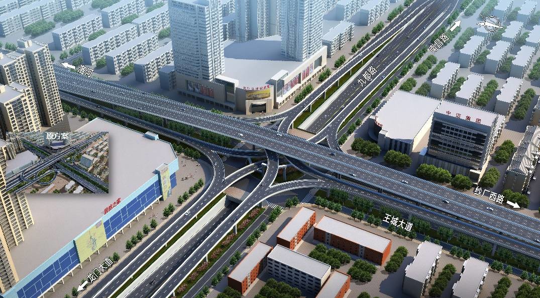 对现状王城大桥进行双向加宽,在现状大桥的两侧各加宽15米宽新桥,设置为1条机动车辅道+1条非机动车道+人行道模式,新桥采用挂篮模式施工。