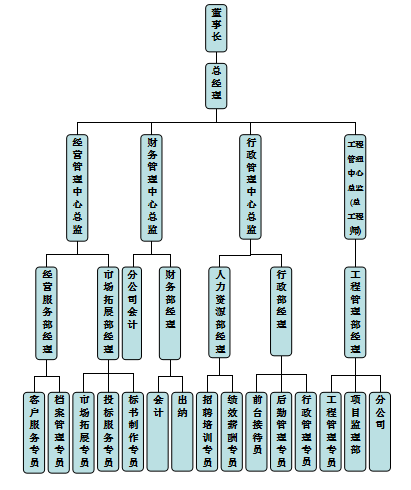 公司按照现代企业管理模式,建立了科学高效的组织机构,现设“一办一部四中心”,分别为总经办、综合部、工程管理中心、人力资源管理中心、经营管理中心、财务管理中心。